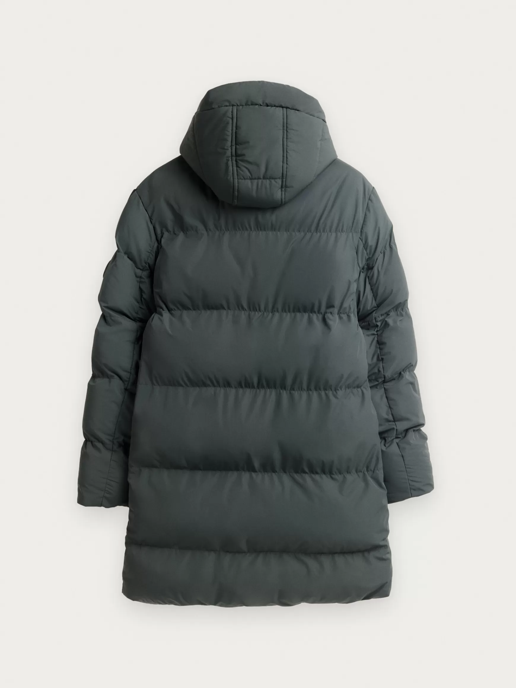 Parka acolchada con cuello subido y gorro ajustable. Cuenta con cierre central mediante doble cremallera, dos bolsillos en la cintura con cierre de cremallera, parche engomado grabado en una de las mangas y bolsillo en su interior. Cremalleras termoselladas. Corte regular fit.