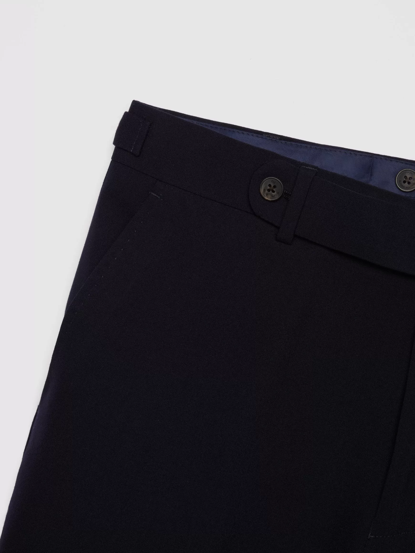 Pantalón de traje que cuenta con cierre frontal con prolonga de botón desplazado y cremallera, dos bolsillos en el frontal y un bolsillo con cierre de botón en la parte trasera. Bajo con vuelta y detalle ajustable en la cintura. Forrado en su interior.
