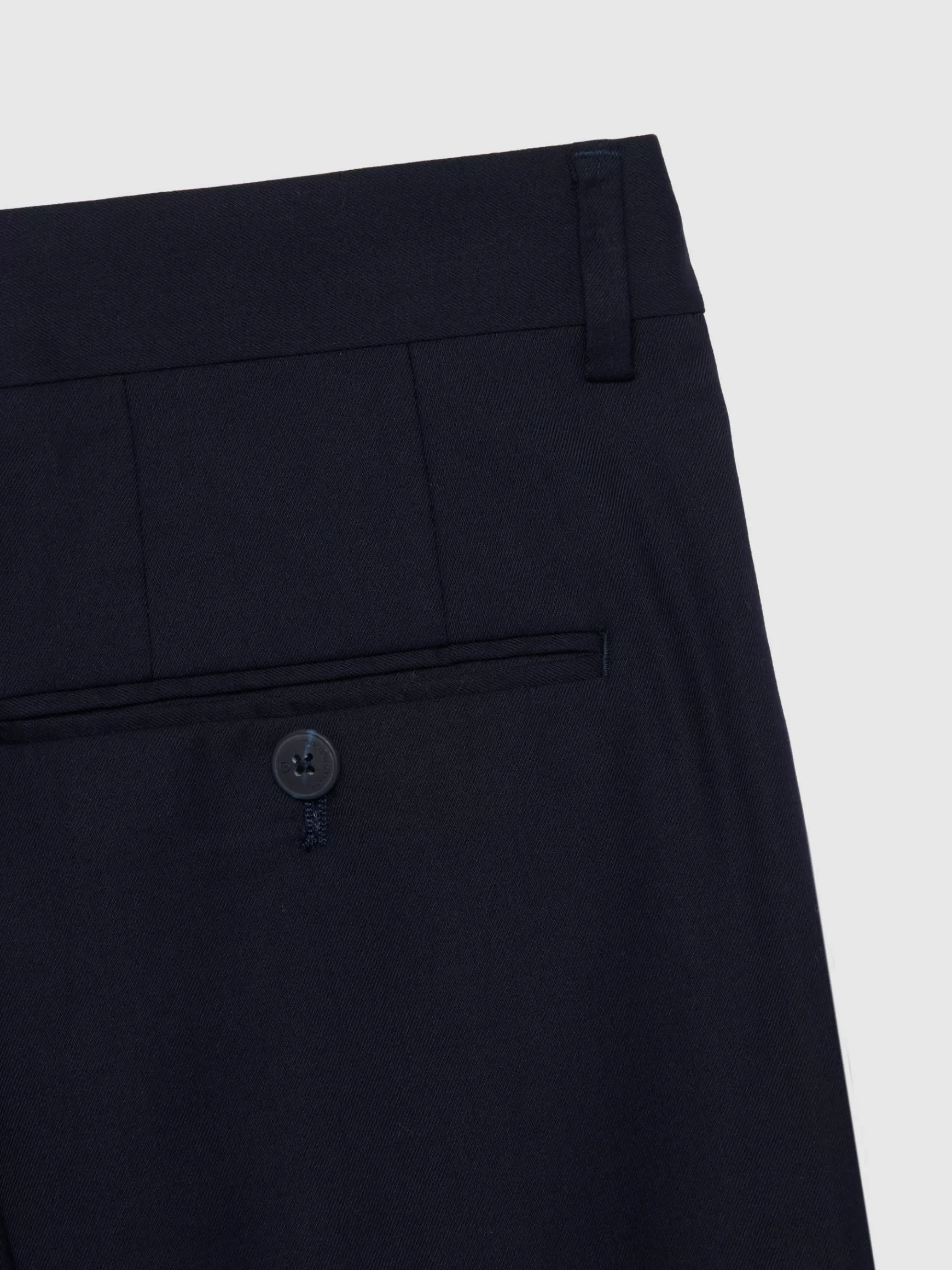 Pantalón de traje que cuenta con cierre frontal de cremallera y botones, dos bolsillos abiertos en la parte delantera y dos bolsillos traseros con cierre mediante botón. Forrado en su interior.