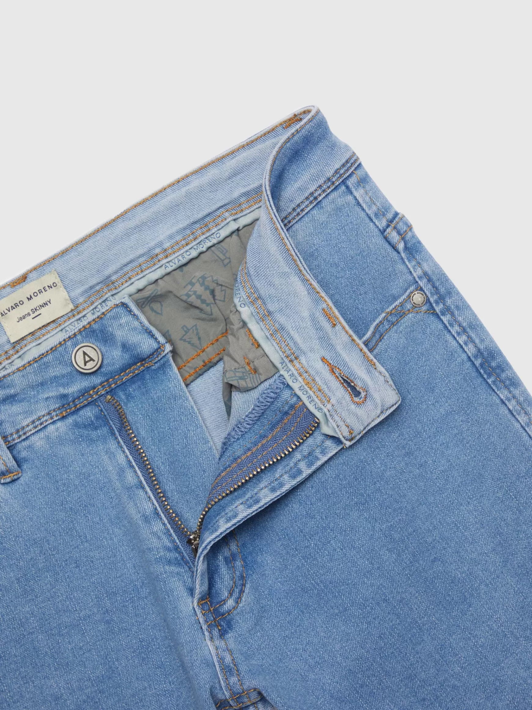 Pantalón denim de corte skinny fit con cinco bolsillos y cierre central mediante botón y cremallera, pespuntes en colo…